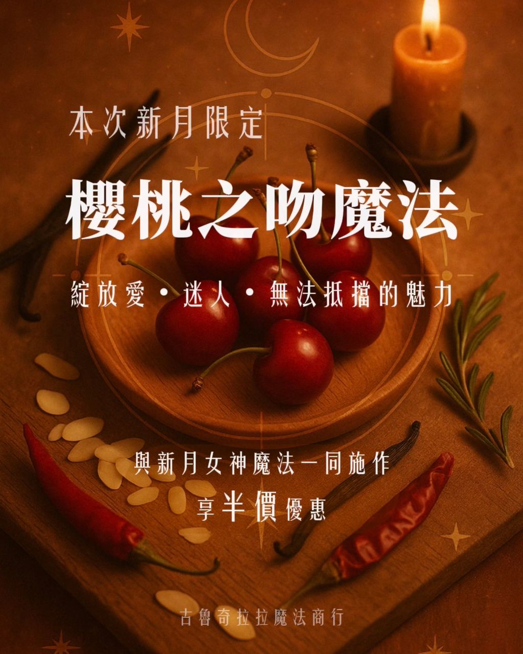 ⭐️⭐️⭐️⭐️新月女神可搭配 4月新月限定「櫻桃之吻魔法」 一同施作,後者享半價優惠(原價1111|優惠半價555)此儀式將助你綻放愛、迷人、無法抵擋的魅力。其先行能量淨化與療癒,舒緩日常緊繃、除去老舊與不潔的能量沾附,後以櫻桃、杏仁、燕麥、香草、辣椒等魔法藥材與特製凱爾特魔法鹽&魔法油進行儀式。